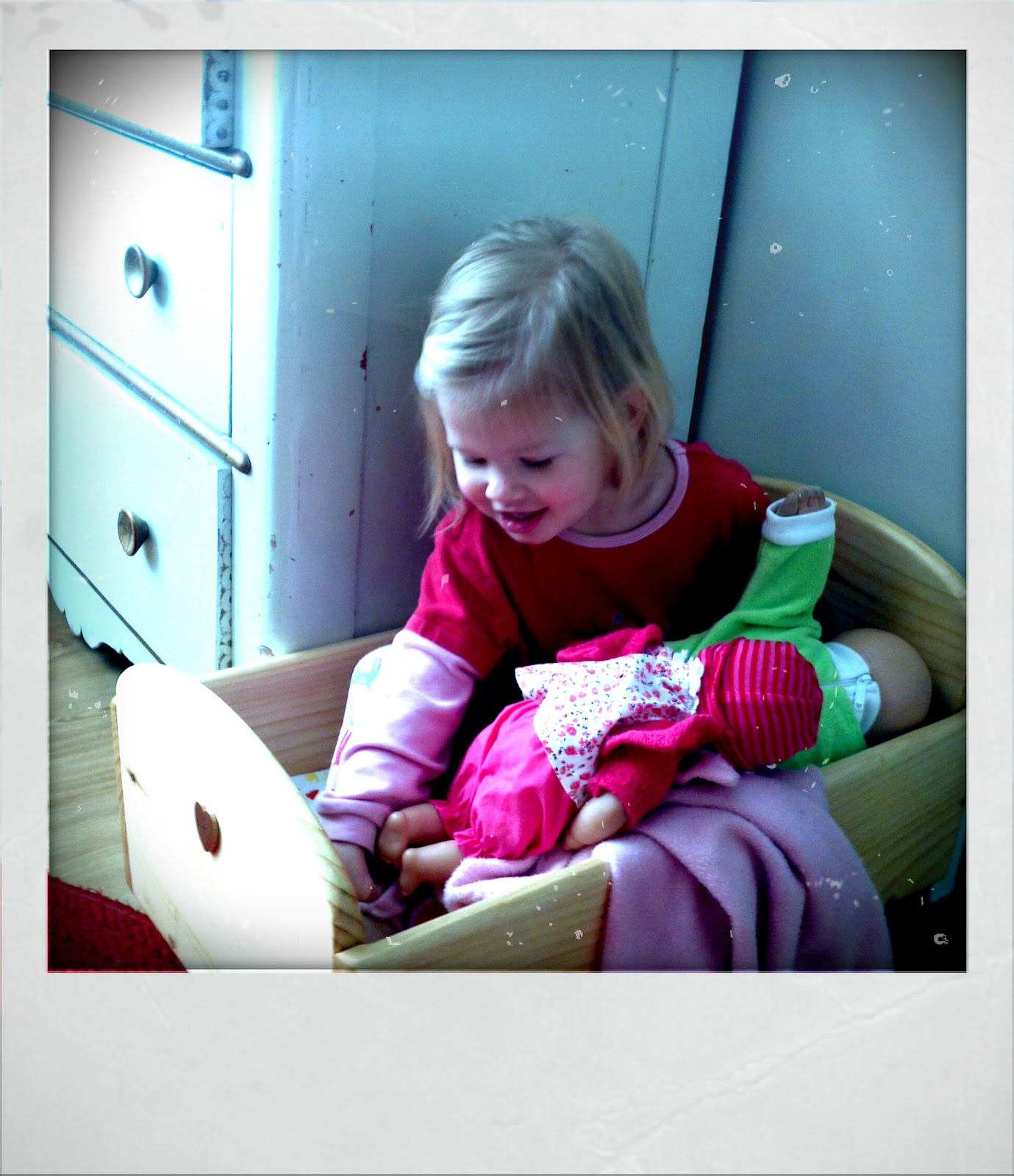 A new shower curtain and table cloth make me smile. It's the little things for me. Aleida helps her babies go to bed ... in her doll crib. I can hardly bear having to tell her she's too big to be doing that.
